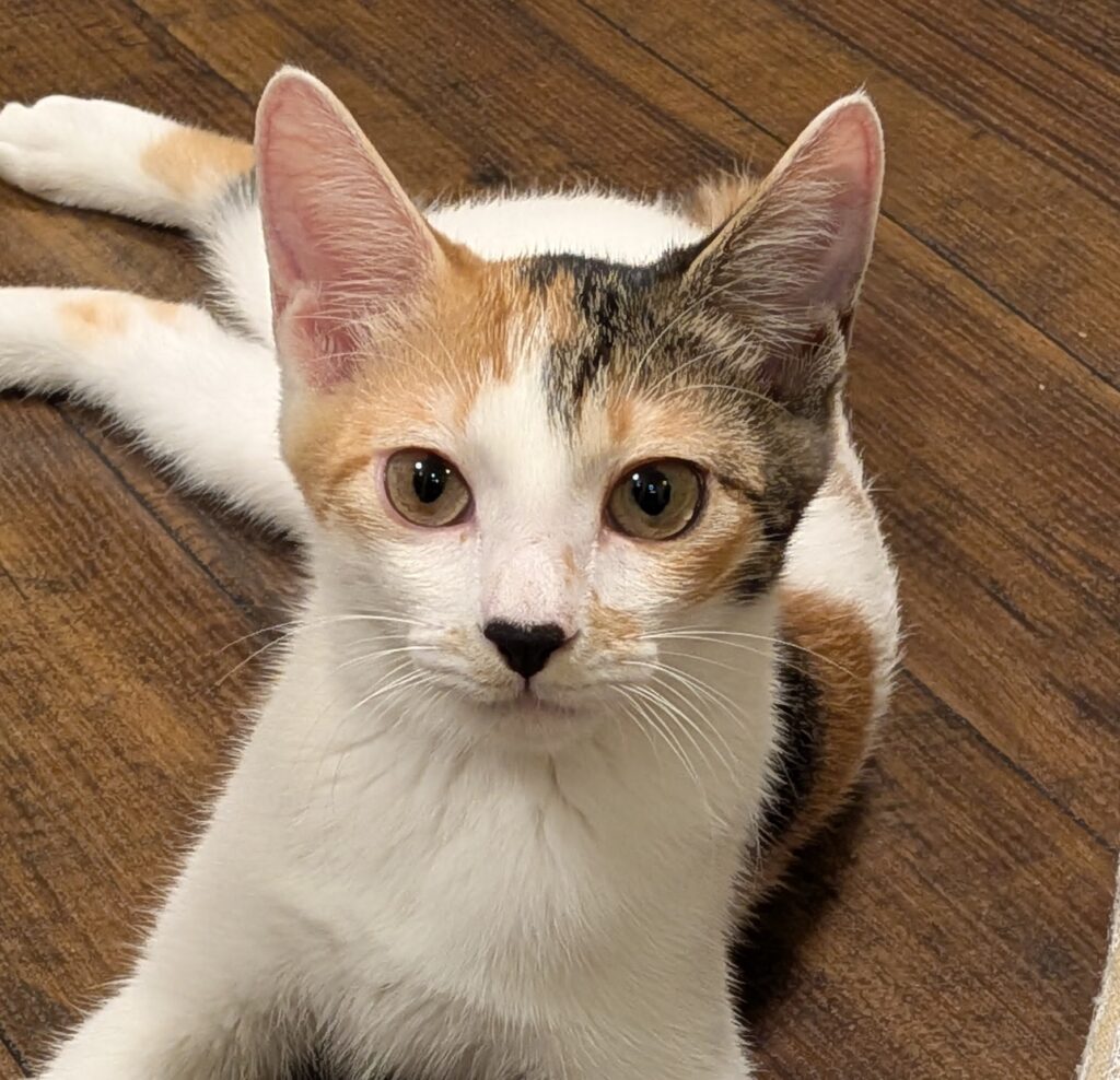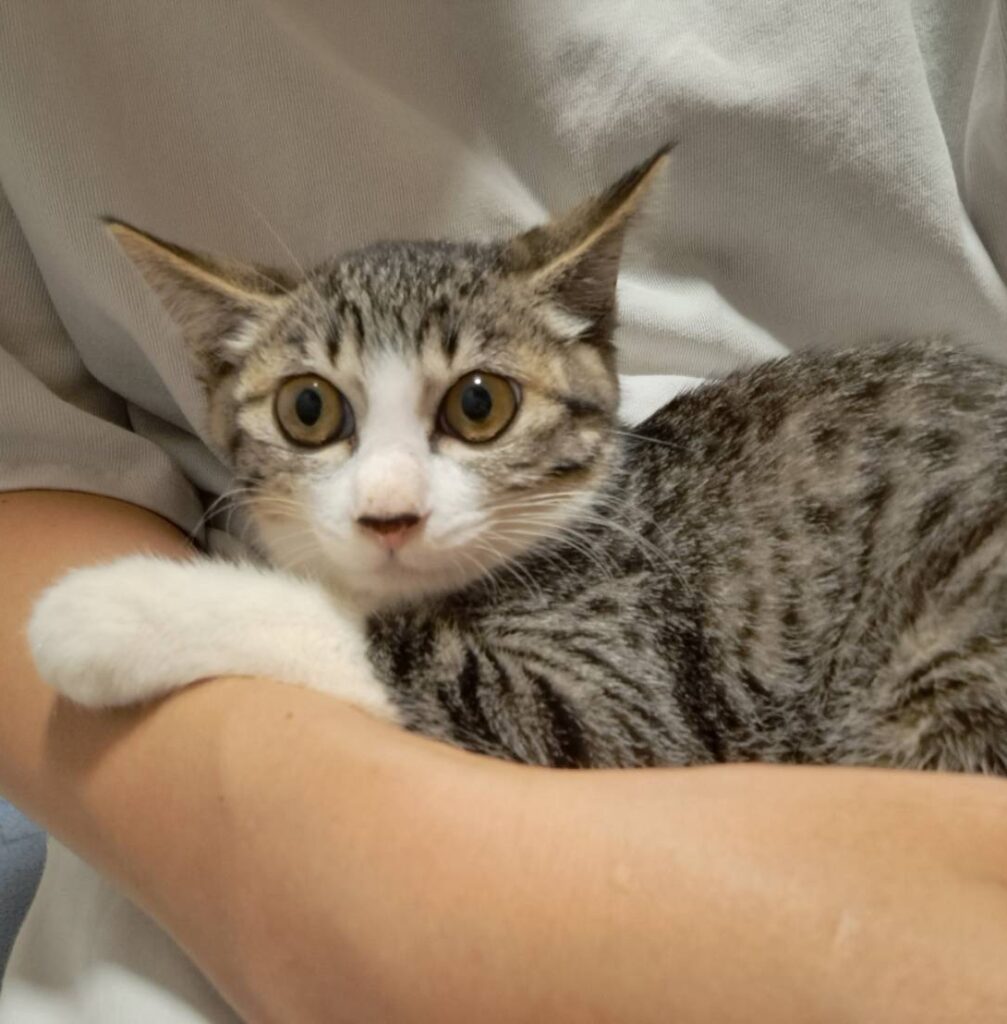 里親募集中 不破(ふわ)ちゃん 2025年5月生まれ女の子 お目目くりくりのかわいいキジ白の女の子。事故でしっぽが切れてしまって、もともと短めしっぽだったのを断尾した結果ぼんぼりしっぽに。お転婆で食いしん坊。兄妹の安積くんより大きい。