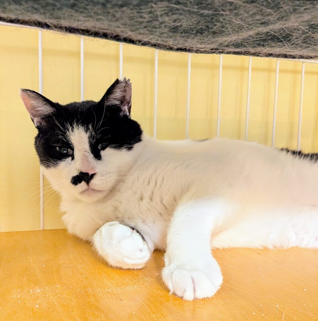 里親募集中 外郎(ういろう) 2017年4月生まれ男の子 牛柄、じと目がむしろチャーミングな大柄な男の子。7年間お外で頑張ってきました。お外ではちょっといじめられっ子だったせいか、あまりほかの猫が好きじゃないかも。人のことは大好きで、すりすり、なでなで要求激しめ。