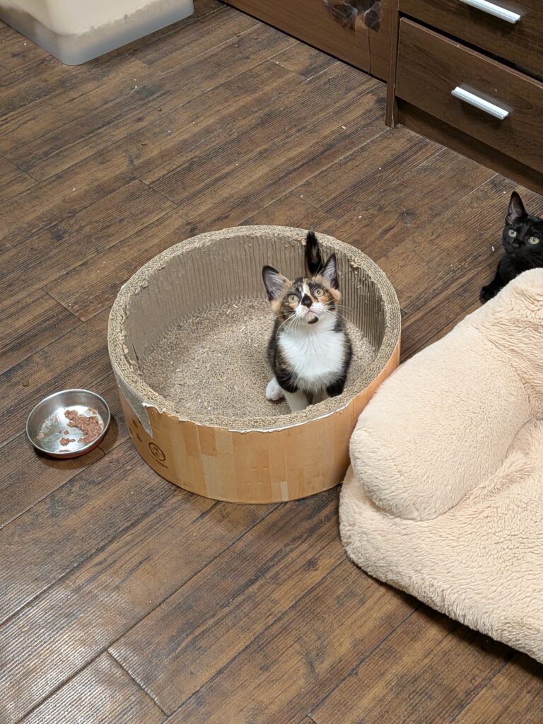 里親募集中 うみちゃん 2025年4月生まれ女の子 薄い三毛の女の子(預かりさん命名)。くっしー(のりしお)、きっしー、こみちゃんの兄妹。お転婆さんで姉妹のこみちゃんにタックルを仕掛けるがだいたい負ける。