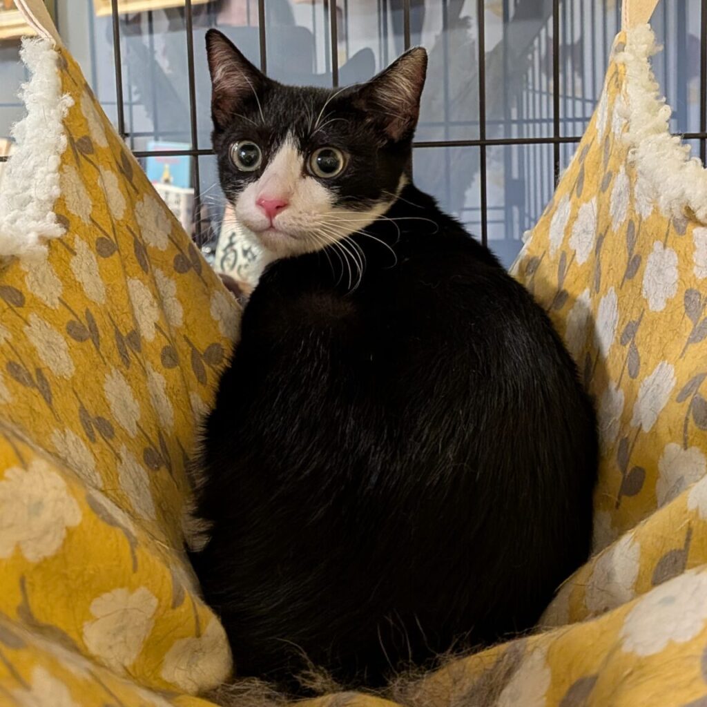 里親募集中 安積(あさか) 2025年5月生まれ男の子 お鼻の両脇に小さい黒い模様があるのが特徴的なハチワレの男の子。不破ちゃんの兄妹。かなりのビビりで、打ち解けるのに時間がかかるけど、本当は遊びたくていつもうずうずしている。