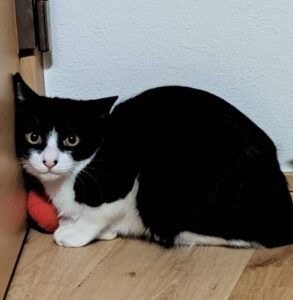 ぼんぼりしっぽのハチワレの男の子。きいちゃんの兄弟。ネーミングライツで名前をもらいました。ビビりだけどかなり腕白で、激しく遊びます。きいちゃんもたじたじ。