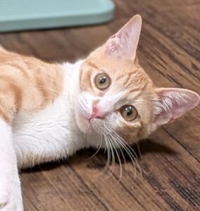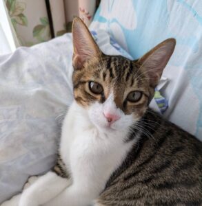 ぼんぼりしっぽ、綺麗な顔立ちの茶白の男の子。みみちゃんの兄弟。ネーミングライツで名前をもらいました。食いしん坊でちょっとシャイ。