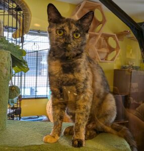 丸顔がかわいい三毛の女の子。捕獲時、ターゲットの猫さん用に捕獲機を置いたら、まっしぐらに捕獲機に入ってしまって、おっちょこちょいなところがあるのかも。食いしん坊です。