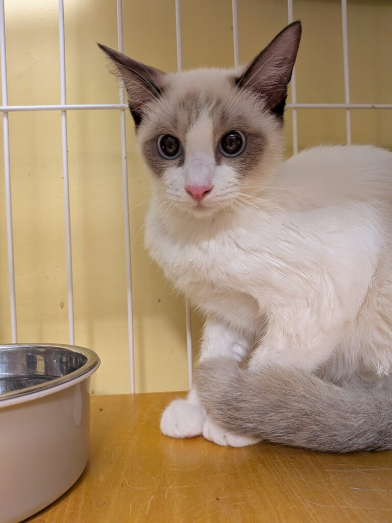 ラグドールみたいな模様のシャムミックスの女の子(短毛)。ルテの姉妹。保護活動をされている方のお宅の駐車場に雨の日に遺棄されました。優雅なルックスとは裏腹に、ものすっごい食いしん坊笑。