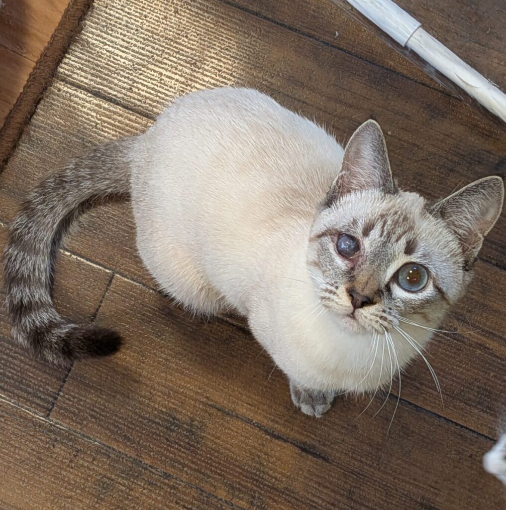 ちょっと縞模様のあるシャムミックスの女の子。ラテの姉妹。保護活動をされている方のお宅の駐車場に雨の日に遺棄されました。風邪をひいていて片目にハンデがありますが、本猫はそんなの全然気にせず、はっちゃけています。
